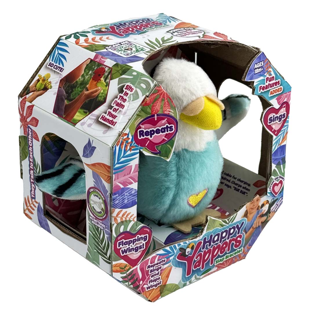 Erleben Sie mit den Happy Yappers interaktiven Spielspaß wie nie zuvor! Diese niedlichen Plüschvögel wiederholen gesprochene Worte und Geräusche, singen das fröhliche Happy Yappers-Lied (Rockin' Robin) und schlagen dabei mit ihren Flügeln.