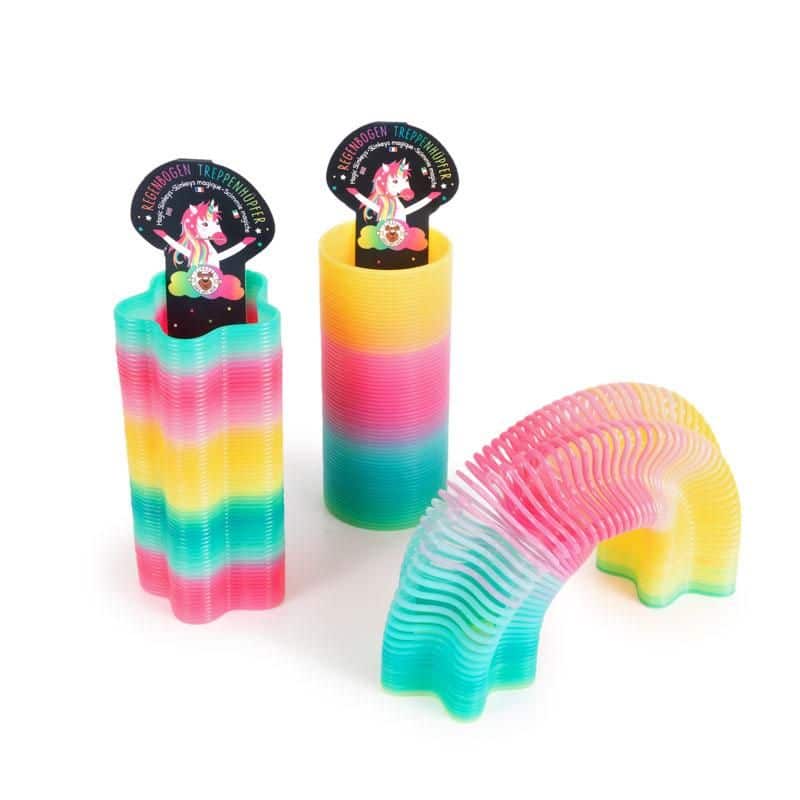 Der TRENDHAUS DREAMLAND Treppenhüpfer in Regenbogenfarben sorgt für Bewegung und Freude bei Kindern. Die handliche Spirale kann als Treppenhüpfer, für coole Tricks oder einfach zum Spielen verwendet werden. Durch die bunten Farben und das federnde Material werden Fingerfertigkeit sowie Hand-Augen-Koordination spielerisch gefördert.