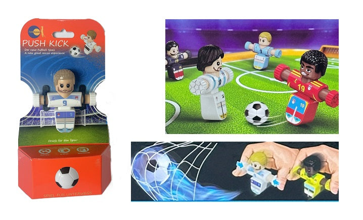 Push Kick bringt die Fußball-Action in deine Hände: Einfach die Arme der Figur zusammendrücken, den Ball kicken und Tore erzielen. Ob alleine oder mit Freund*innen, das Mini-Fußballspiel sorgt für packende Matches und unvergessliche Spielmomente.