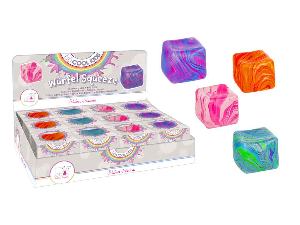 Die leuchtenden Farben mit modernem Marmoreffekt machen den Squishy-Würfel zu einem echten Hingucker. Gleichzeitig kann das Drücken und Kneten helfen, Stress abzubauen und die Hände zu beschäftigen.