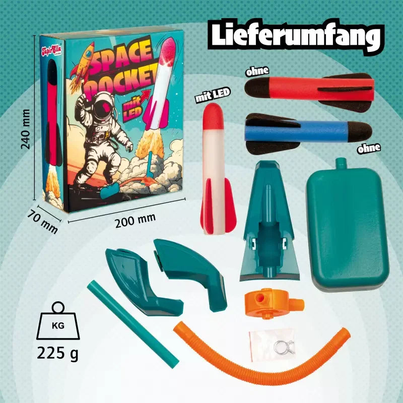 Bereit zum Raketenstart? Mit der TapirElla Space Rocket Luftdruckrakete wird das Kinderzimmer zur Startrampe! Einfach auf das Luftkissen treten – und schon saust die Rakete in die Höhe. Drei Schaumstoffraketen sorgen für actionreichen Spielspaß, eine davon sogar mit coolem LED-Licht für extra Leuchteffekt. Die Raketen kommen in einem hübschen Geschenkkarton und sind ideal für draußen und drinnen geeignet. Der Aufbau ist kinderleicht: Standfuß aufstellen, Luftkissen anschließen, und schon kann das Raketen-Abenteuer beginnen!